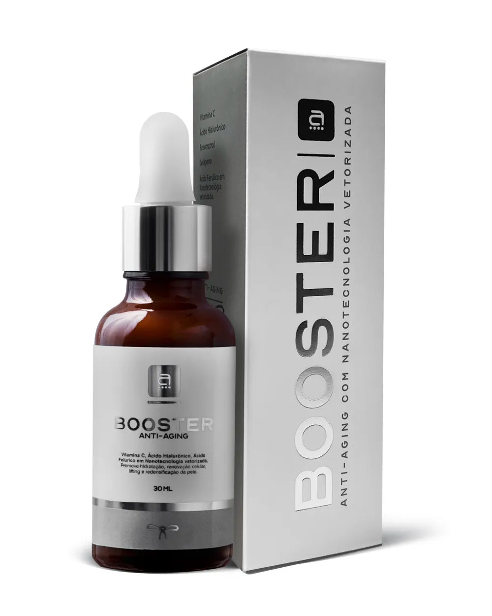 O “Booster Anti-aging ” é um sérum facial concentrado que purifica e acalma a pele, reduzindo a aparência das linhas de expressão e rugas ao mesmo tempo que proporciona maciez e viço. Contém os ativos antioxidantes nanoencapsulados: Vitamina C, Resveratrol, Ácido Hialurônico, Colágeno e Ácido Ferúlico, que apresentam maior poder de penetração nas camadas da pele, interagindo e atuando de forma mais intensa. Uniformiza o tom da pele e melhora visivelmente a firmeza da pele. Não contém Retinol e é indicado para todos os tipos de pele.