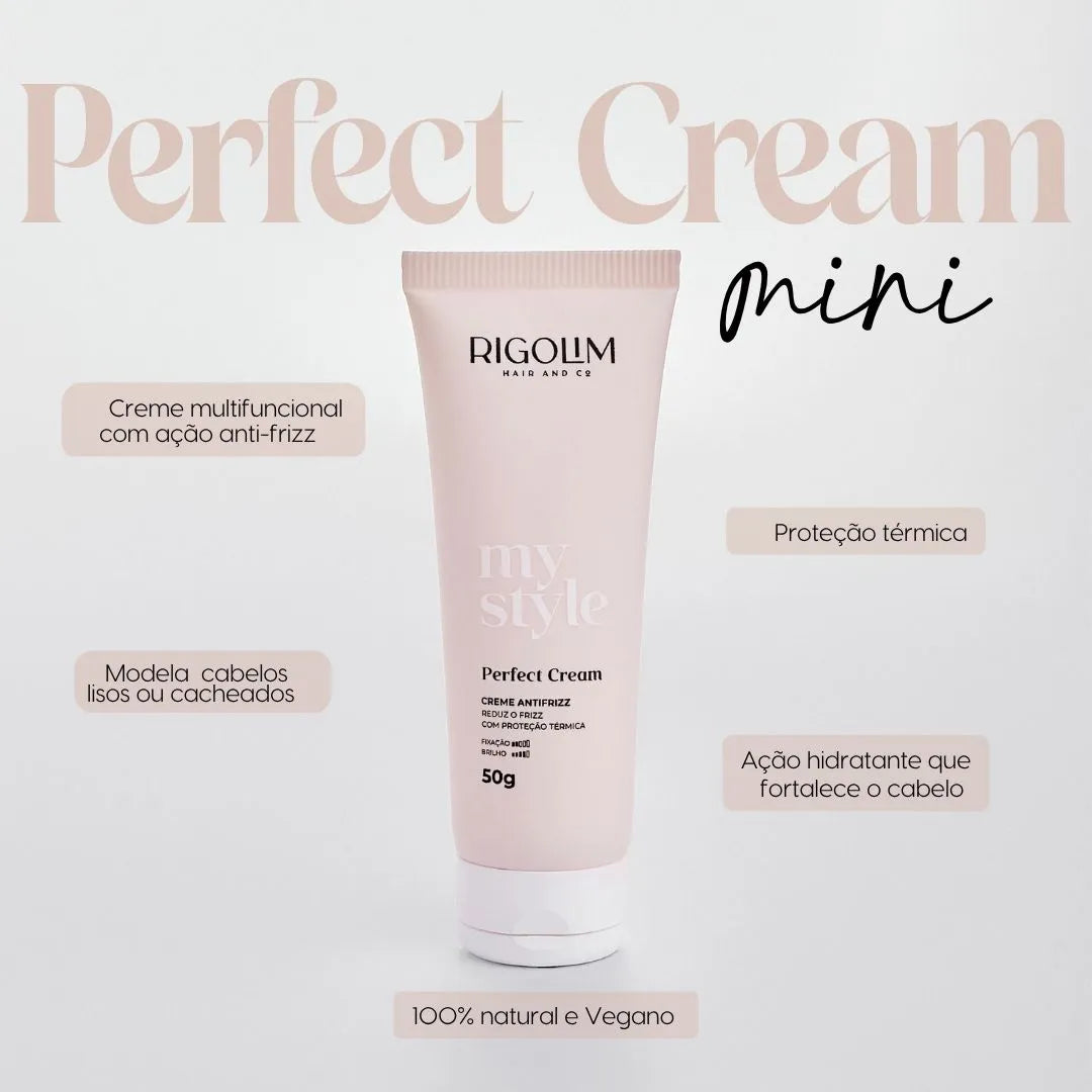 O creme anti-frizz PERFECT CREAM, da marca Rigolim Hair and Co, é a solução ideal para quem busca um produto multifuncional para preparação e finalização de penteados. Com proteção térmica, a pomada é capaz de controlar o frizz dos cabelos tanto lisos quanto cacheados, mantendo-os no lugar por muito mais tempo.