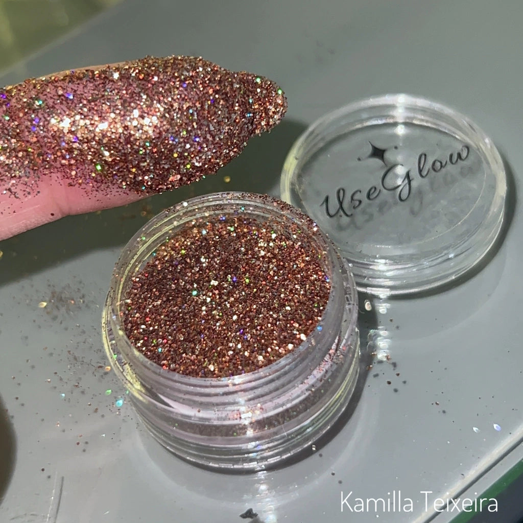 Os glitters Use Glow são criados a partir de combinações exclusivas de partículas de brilhos, em diferentes tamanhos, cores e intensidades. Esses produtos são desenvolvidos para trazer inovação, altíssima qualidade e brilho intenso à sua maquiagem. Por mais que eles tenham se popularizado entre o universo da maquiagem profissional e automaquiagem, eles também podem ser utilizados para a decoração de unhas.