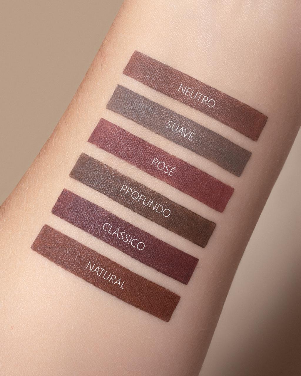É um lápis envasado na madeira, o que permite uma ponta extremamente fina, resistente e que não quebra com facilidade. Isso garante mais precisão na aplicação e também que o produto seja aproveitado até o final. A cartela de cores foi desenvolvida a partir de uma pesquisa profunda, ouvindo o nosso público no Brasil e buscando o que existe de mais interessante nos EUA e na Itália.